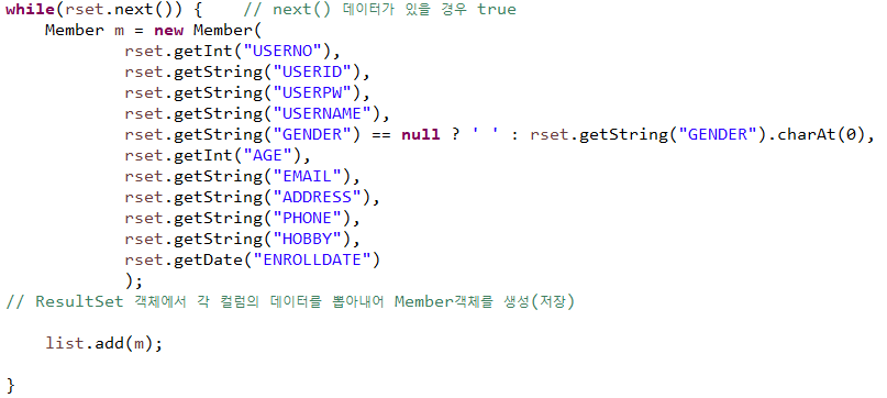ResultSet rset = stmt.executeQuery("SELECT * FROM MEMBER");