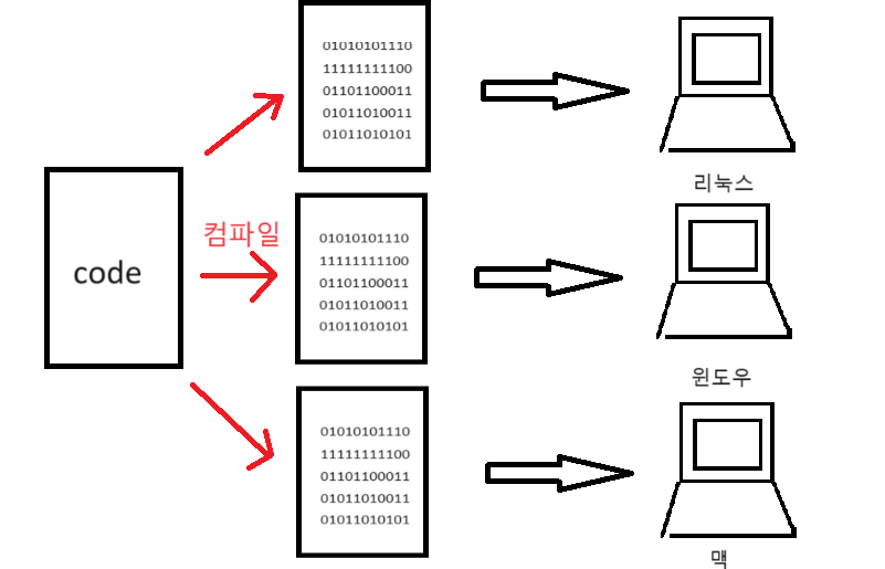 일반적으로 C언어는 운영체제 마다 서로 다른 컴파일러는 두어 각 운영체제에 맞는 컴파일 과정을 실행해야 한다. 윈도우와 리눅스는 서로 컴파일된 기계어를 호환하지 않고 맥과 윈도우, 맥과 리눅스 등도 마찬가지이다. 따라서 각각의 운영체제마다 서로다른 각각의 컴파일러를 두어야 하는 불편함이 있다. 하지만 자바는 이것을 해결하기 위해 JVM 사용한다.